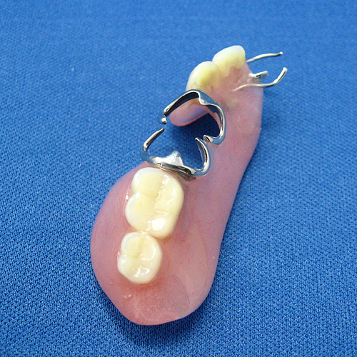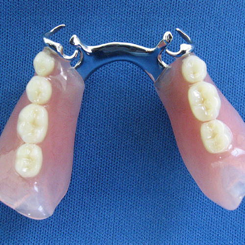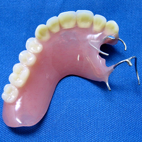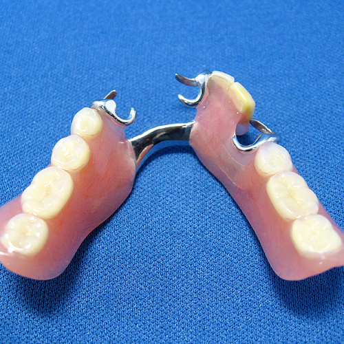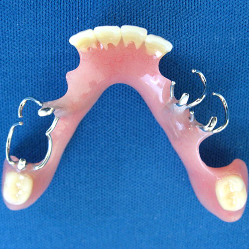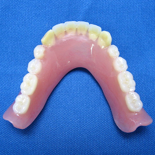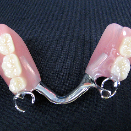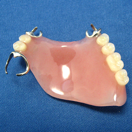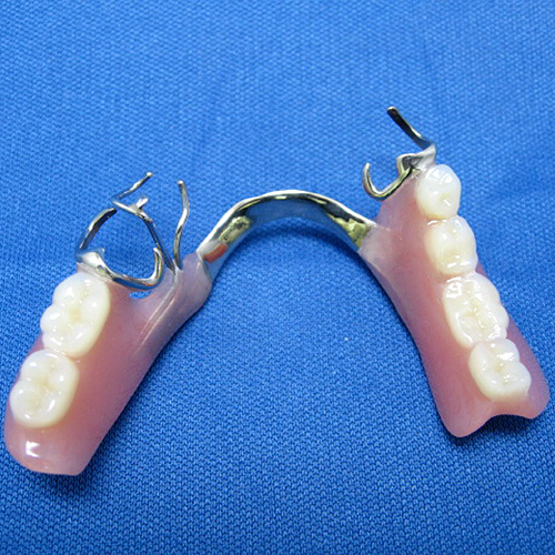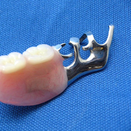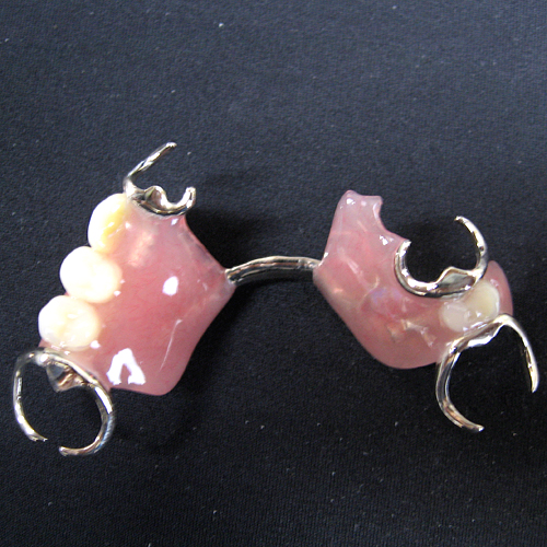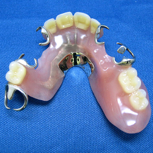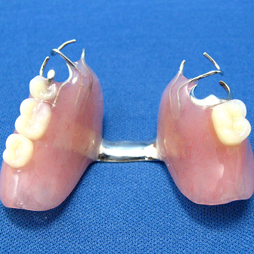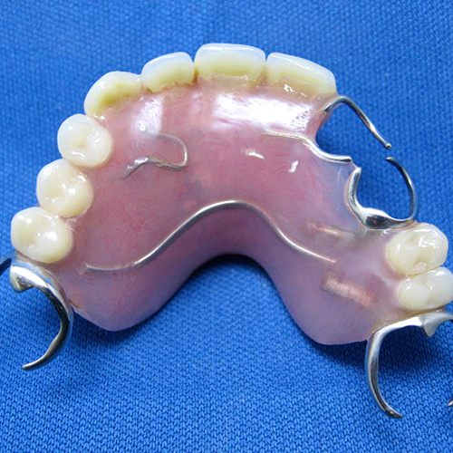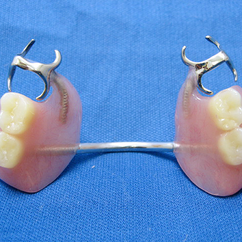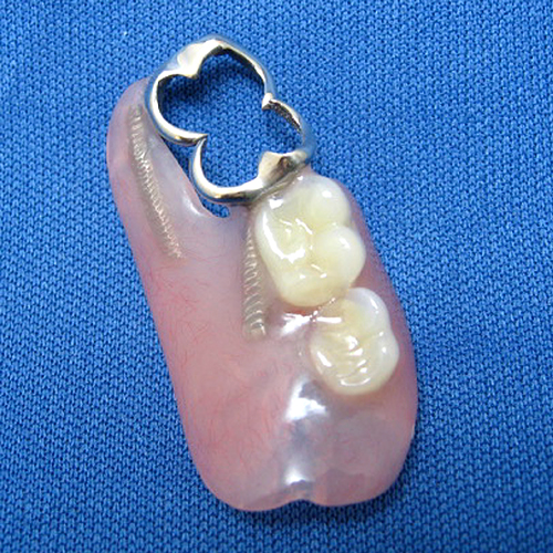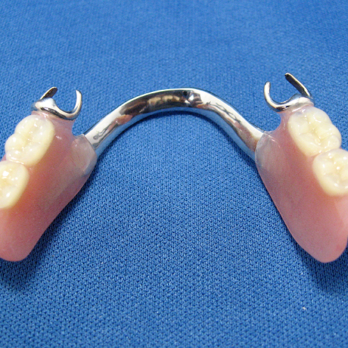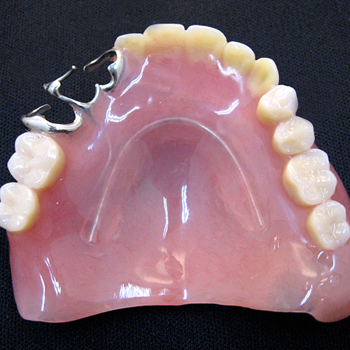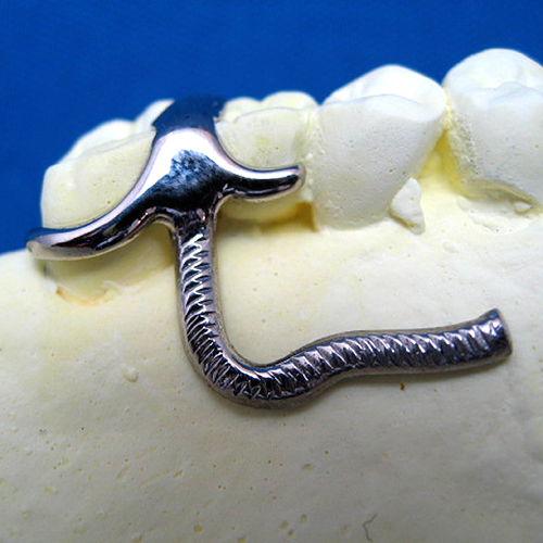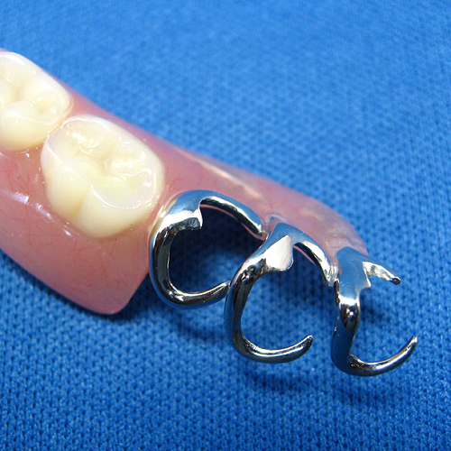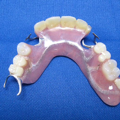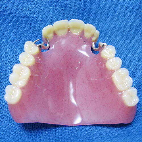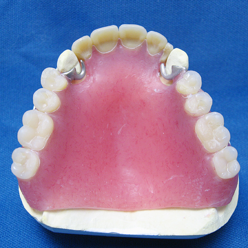 残存歯にキャストクラスプで維持を求めるタイプの義歯。鋳造バーと併用することで、上顎口蓋部を覆わずに異物感を軽減することができます。また、床を小さくしても咬合圧の分散ができます。